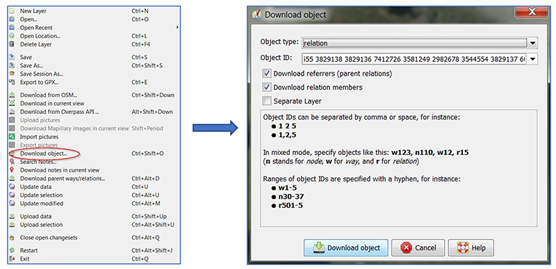 Because of the large number of users and edits, it is inevitable for some map features to remain unbroken. Some turn restrictions have been added with more or fewer members than they must have, so we need to correct them to have the right structure. A correct restriction must have 3 members: a way from which restriction starts (from), a node, a way or multiple ways that connect the beginning and ending of the restriction (via) and a way where the restriction ends (to). We wrote a query which selects all the ways that have turn restrictions and took out those which have 3 members, remaining only those with odd numbers. After that, we created a table with these restrictions, we selected all relation_ids and downloaded them as .csv file. The relation_ids we selected can be copied from the created file and downloaded in the Java OpenStreetMap editor (JOSM) using File-Download object (Fig.3). Just make sure you select Object type: relation (Fig.4).
