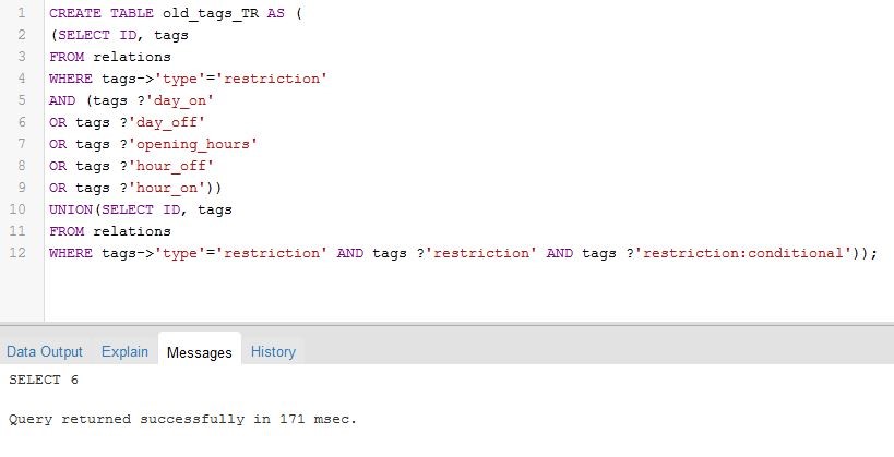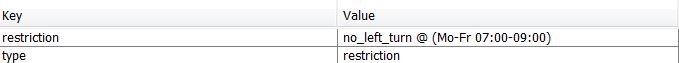There are some tags which are not used in OSM anymore and they have not been changed to the new structure. We need to change their format, so the application can process them. Let's take conditional turn restrictions for example. A conditional turn restriction has a more complex structure than a usual restriction because of its defined period of time. During these periods, a specific maneuver is strictly forbidden. We have a query for conditional restrictions to select all those which have been added with the old structure (Fig.5). After creating the table, we can extract them from the database, and finally correct them in JOSM (Java OpenStreetMap) (Fig.6).